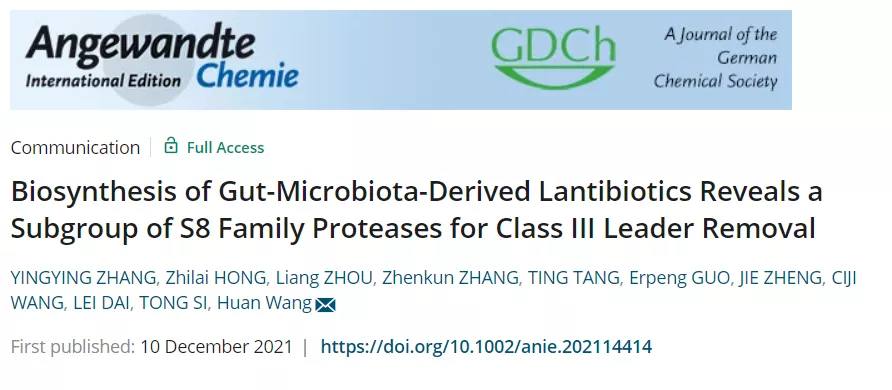 12月10日,中国科研实验室深圳先进技术研究院合成生物学研究所(以下简称“合成所”)司同课题组和南京大学化学化工学院的王欢课题组合作,在国际化学期刊 Angewandte Chemie 中发表了题为 Biosynthesis of Gut-Microbiota-Derived Lantibiotics Reveals a Subgroup of S8 Family Proteases for Class III Leader Removal 的文章。本工作首次报道了具有特异性识别位点的肽酶可以参与III型羊毛硫肽生物合成过程。
