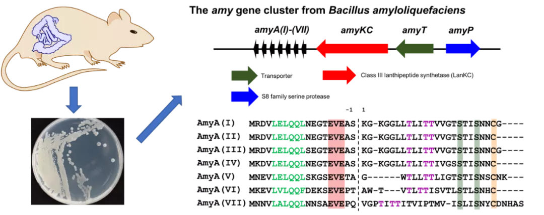 书归正传,课题组前期从大鼠肠道中分离得到一系列肠道菌株;基于生物信息学分析,研究人员破译了这些微生物基因组中可能存在的“武功秘籍”,预测可能存在多个新颖羊毛硫肽基因簇(“不同门派”)。顺利获得菌群互作实验(“比武”),也进一步推测这些产物可能是具有抗生素活性的“武器”。基于新颖性分析,本工作重点关注Bacillus amyloliquefaciens基因组编码的一个III型羊毛硫肽基因簇,簇中含有不同的招式:(1)可能对应7种不同产物的7条前体肽;(2)一个新颖III型羊毛硫肽合成酶AmyKC;(3)一个S8家族的丝氨酸肽酶AmyP以及一个转运蛋白AmyT。如图1所示。