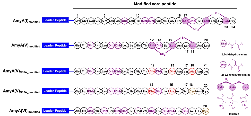 结合大肠杆菌异源表达和体外生化反应,研究人员成功取得III型羊毛硫肽产物,结合高分辨质谱、点突变实验以及化学衍生等手段对多肽的化学结构进行了鉴定:其中AmyA(I)和AmyA(V)均具有labionin的特征结构而AmyA(VI)则只具有线性的多肽结构。这一结果显示AmyKC具有良好的底物宽泛性,并能特异性地对多肽进行不同程度的修饰,取得多样性的产物。最近的一系列研究表明,同一个羊毛硫肽基因簇合成多种产物似乎是肠道菌羊毛硫肽基因簇的特征,而在环境菌中较为罕见。这也暗示了肠道中的“微生物江湖”比其他环境更为险恶,微生物不得不随身携带多种武器用于防身。如图2所示。