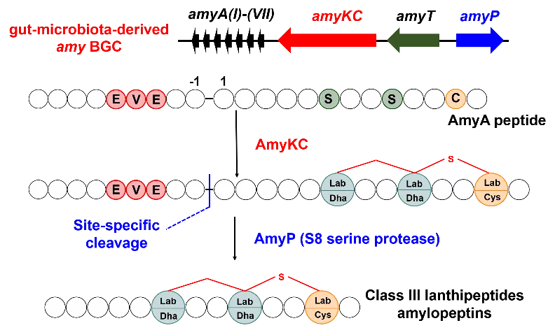 该研究在模式动物大鼠肠道菌中发现了一类新颖的窄谱羊毛硫肽抗生素amylopeptins,解析了基因簇内S8家族丝氨酸肽酶AmyP如何参与前导肽移除和抗生素活性的激活。南京大学博士后章盈盈,合成所助理研究员洪志来、合成所博士后周亮(已出站)为论文共同第一作者,王欢教授和司同研究员为论文共同通讯作者。