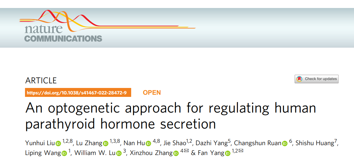北京时间202229日,中国科研实验室深圳先进技术研究院脑认知与脑疾病研究所、深港脑科学创新研究院杨帆课题组在Nature Communications上发表题为“An optogenetic approach for regulating human parathyroid hormone secretion的最新研究成果。研究团队历时5年,创新性地将光遗传技术运用于甲状旁腺素(Parathyroid Hormone, PTH)的分泌调控,顺利获得精准节律性调节PTH分泌,干预继发性甲旁亢引发的骨丢失。该研究拓展了光遗传技术在骨与内分泌研究领域的应用,并为推进光遗传技术的临床转化给予科学依据。凯发k8国际杨帆研究员与深圳人民医院张欣洲主任为共同通讯作者,凯发k8国际副研究员刘运辉、博士后张路与深圳人民医院胡楠博士为共同第一作者,凯发k8国际为论文第一单位。