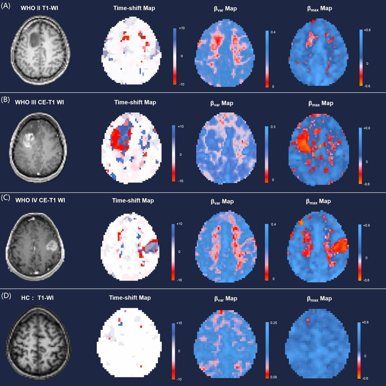 胶质瘤患者和健康对照者BOLD-fMRI时间偏移分析示例。A.WHO II胶质瘤患者(35岁,男性,左额星形细胞瘤); B. WHO III胶质瘤患者(26岁,女性,左额间变型星形细胞瘤); C. WHO IV胶质瘤患者(68岁,女性,右额胶质母细胞瘤); D. 健康被试(HC, 26岁,女性)。