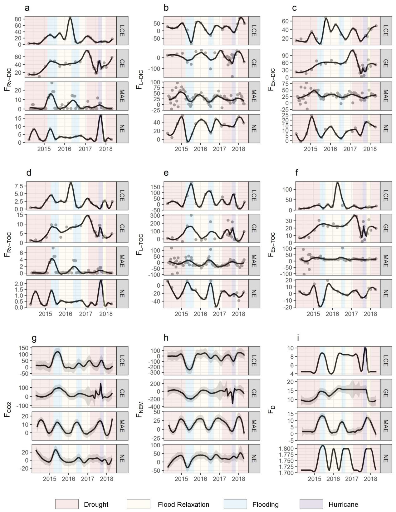 1:2014~2018年墨西哥湾西北河口群不同碳通量的变化。(单位: mmol·C·m-2·d-1)