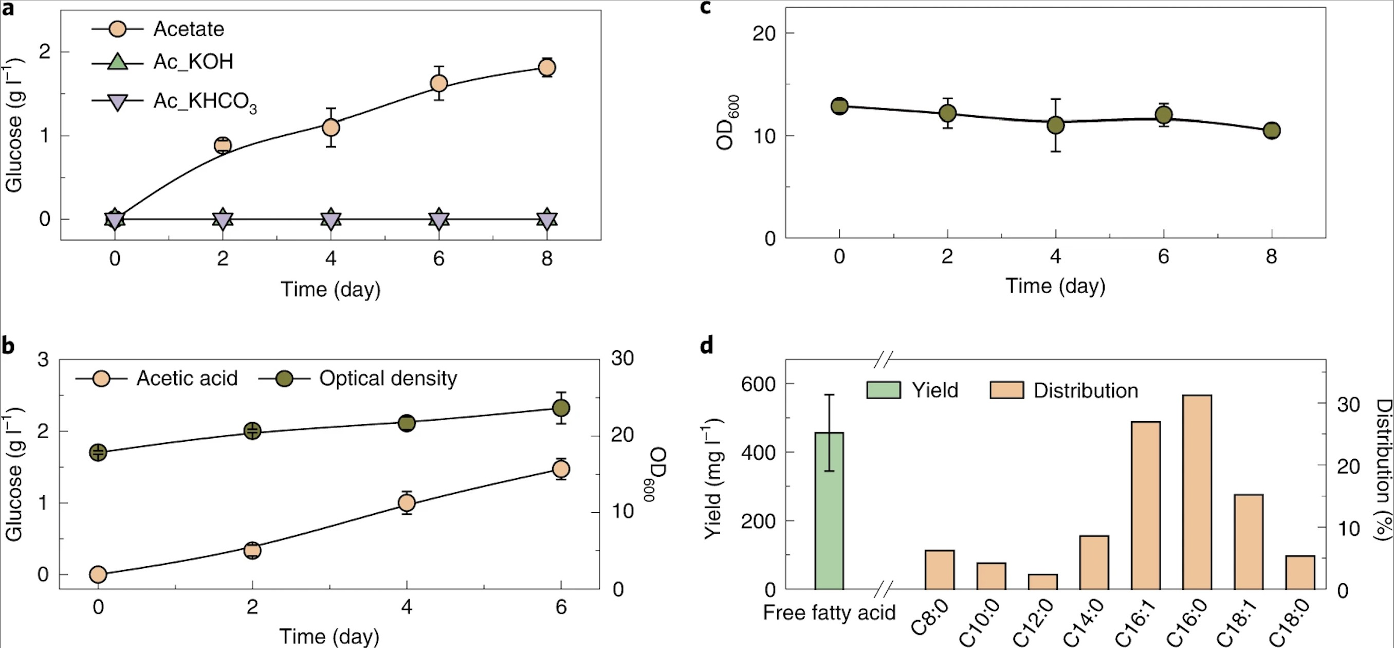 图4:以乙酸盐及乙酸为碳源合成葡萄糖及脂肪酸