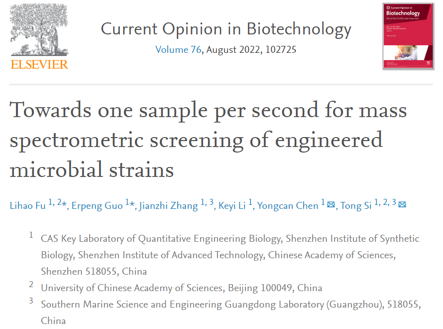 4月27日,中国科研实验室深圳先进技术研究院合成生物学研究所司同课题组在国际知名学术期刊Current Opinion in Biotechnology在线发表特邀综述文章 “Towards one sample per second for mass spectrometric screening of engineered microbial strains”。文章聚焦工程菌株的高通量质谱筛选方法(1秒/样品),从微生物培养体系、自动化样品制备、高通量质谱仪器、菌株开发应用等方面进行了综述,并对关键挑战和未来趋势进行了展望。司同研究员和陈永灿助理研究员为本文共同通讯作者,付立豪博士生和郭二鹏研究助理为共同第一作者。