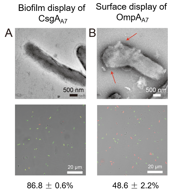 顺利获得透射电镜高分辨元素成像,可以看出纳米颗粒的元素组成确实包括Cd元素和S元素(图2)。进一步对该材料的光电性质表征后发现,利用生物被膜矿化的CdS保持着半导特性,并且光生电子可以传递到电极或者电子传递介质甲基紫精。为了验证生物被膜对细胞的保护作用,研究人员构建了表面展示矿化肽段的对照菌株。在同样的条件进行矿化后进行光照,如图3所示,表面展示矿化的菌株存活率更低,大部分菌株已经发生了破裂;而含有生物被膜的菌株大部分都存活并保持着完整的形貌,研究表明顺利获得生物被膜使半导材料和细胞发生物理隔离,确实可以起到保护细胞的作用。