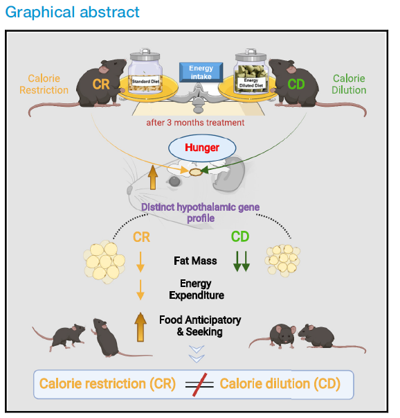 为此John R. Speakman 研究组深入探究了这两种不同的“限制”方法对模式动物带来的不同影响。研究人员分别用传统能量限制方法CR和纤维素稀释食物的方法CD对C57BL/6系小鼠进行了90天的能量限制,观察并比较了在能量限制期间两种限制方法下小鼠的体重、脂肪重量、各个器官组织应对能量匮乏的响应、代谢生理指标、动物行为的差异以及在能量限制后两组小鼠下丘脑的基因表达谱的差异以及与对照组的差异。实验结果表明经历饥饿的过程似乎是CR限食延长寿命和延长健康寿命背后机制的一个关键因素。该研究成果于2022年5月17日在国际主流期刊Cell Reports上发表了题为“Calorie restriction and calorie dilution have different impacts on body fat, metabolism, behavior and hypothalamic gene expression” 的研究论文。中国科研实验室遗传与发育生物学研究所John R. Speakman 研究组的刘雪、金增光为共同第一作者,中科院深圳先进技术研究院的John R. Speakman研究员为通讯作者。