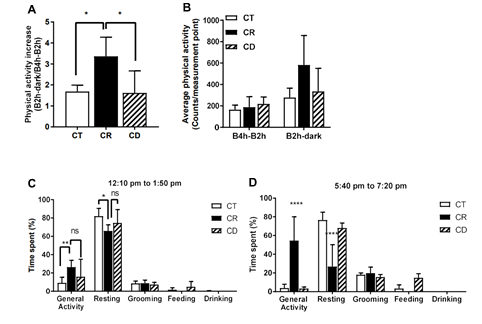 在相关激素方面,两种模式的CR小鼠均出现了Leptin(瘦素)和胰岛素的显著下降。在能量代谢方面,它们都出现了代谢率的下降,而CR小鼠下降得更为明显。两种限食方法对动物行为产生的影响差异也很大。CR 小鼠在每天投喂食物前会表现出明显的食物预期行为;然而CD 小鼠则在白天更加活跃(图2)。