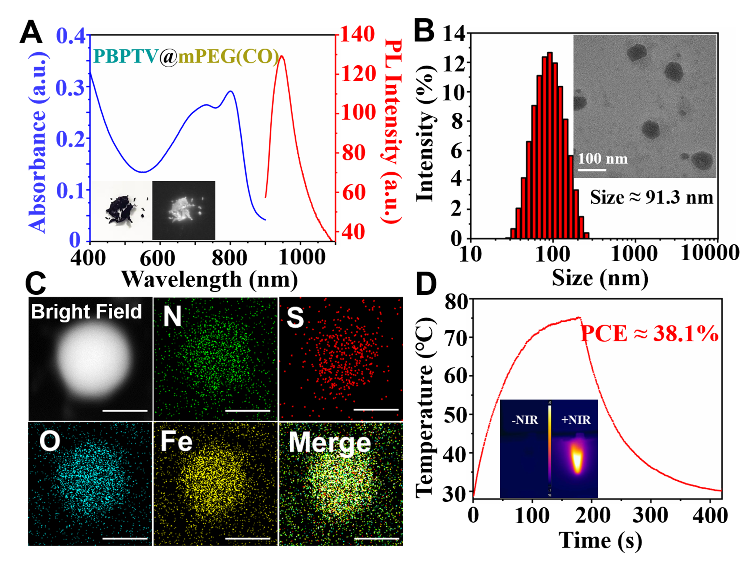 2. (A) 纳米炸弹水溶液的紫外吸收光谱(蓝色)和荧光发射光谱(红色);(B) 顺利获得TEMDLS测量出纳米炸弹的粒径。比例尺100 nm;(C) 纳米炸弹的EDS元素分析。比例尺50 nm;(D) 在808 nm近红外激光下,热成像相机记录的纳米炸弹溶液升温曲线。实验结果表明纳米炸弹具有稳定的颗粒性质及优良的光热性能。