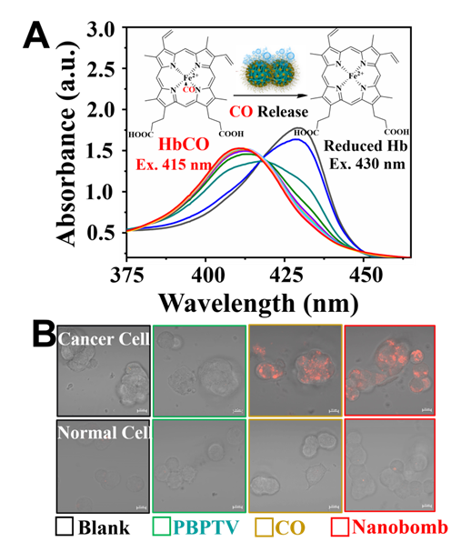 3. (A)紫外光谱曲线变化揭示经还原血红蛋白测试的纳米炸弹溶液中CO的释放过程;(B)共焦荧光显微镜成像癌细胞和正常细胞中CO的表达。比例尺10 mm。实验结果表明纳米炸弹能够响应过表达的过氧化氢并释放CO气体。