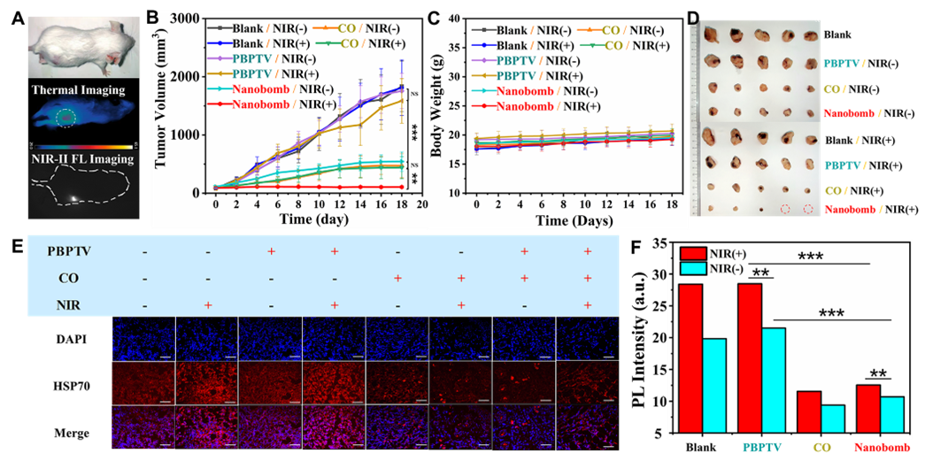 5. (A)荷瘤小鼠的光热治疗过程图片和NIR-II荧光成像图片;(B18天内小鼠肿瘤体积变化曲线;(C)治疗期间小鼠的体重变化;(D)治疗后的小鼠肿瘤照片。(E)肿瘤组织染色切片显示不同实验条件处理下HSP70的表达。比例尺100 mm;(F)不同实验条件处理下肿瘤组织表现出显著差异。(*P<0.05,**P<0.005***P<0.0005)。实验结果表明纳米炸弹能够抑制小鼠肿瘤中HSP70的表达,成功实现癌症低温光热治疗。
