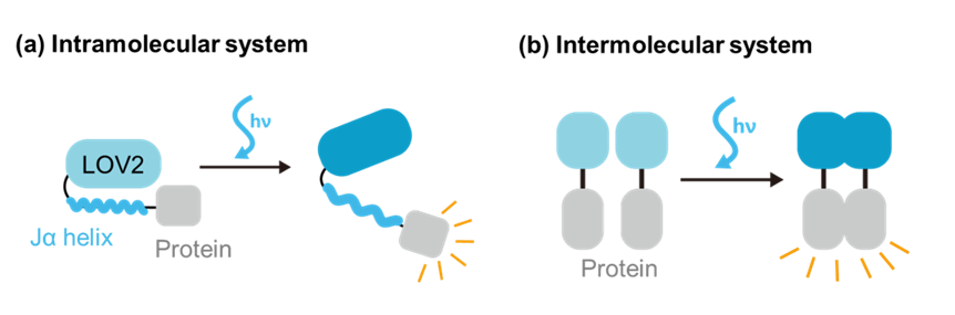 图1 | 光遗传系统的示意图(a)基于空间位阻机理的分子内体系。(b)基于光感受器二聚体的分子间体系。