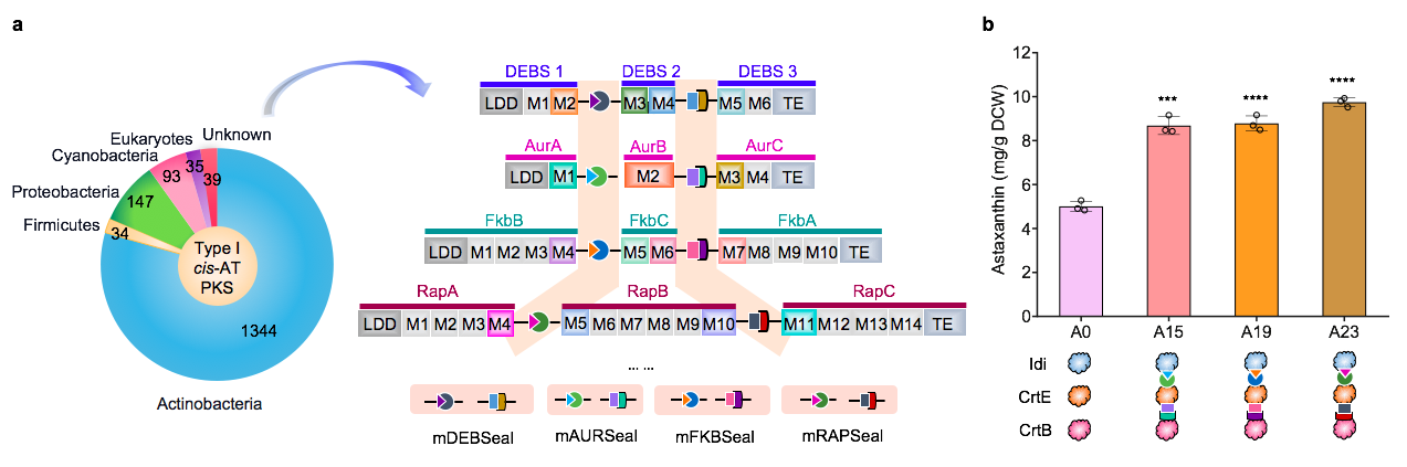 北京时间9月22日,中科院深圳先进技术研究院马田副研究员、武汉大学刘天罡教授团队与邓子新院士合作在Nature Communications上发表题为"Metabolic pathway assembly using docking domains from type I cis-AT polyketide synthases"的研究成果。该研究模拟了天然模块聚酮合酶的有序组装,开发的mPKSeal策略能够有效提高人工细胞工厂的合成效率。