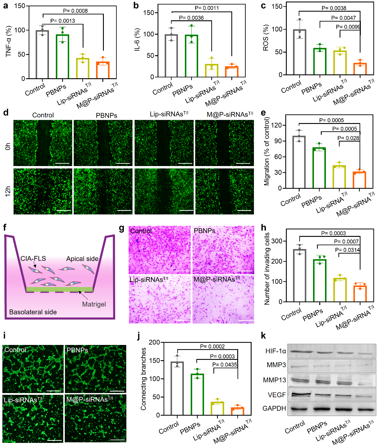 类风湿关节炎体外治疗研究。相比传统抗体类治疗药物,siRNA可以与 mRNA序列特异性配对,从源头抑制促炎因子相关基因的表达。此外,针对类风湿关节炎微环境过表达的ROS以及乏氧特点,研究人员使用了具有催化酶特性的普鲁斯兰,不仅可以清除ROS,还可以催化过氧化氢产生氧气,进而调控RA微环境。顺利获得仿生膜体系的递送,同时提高了siRNA/普鲁斯兰的稳定性和靶向能力。结果证实,M@P-siRNAsT/I在TNF-α/IL-6/ROS等多炎症因子的表达、滑膜成纤维细胞的迁移和新生血管形成方面发挥了很好的抑制效果(图3)。
