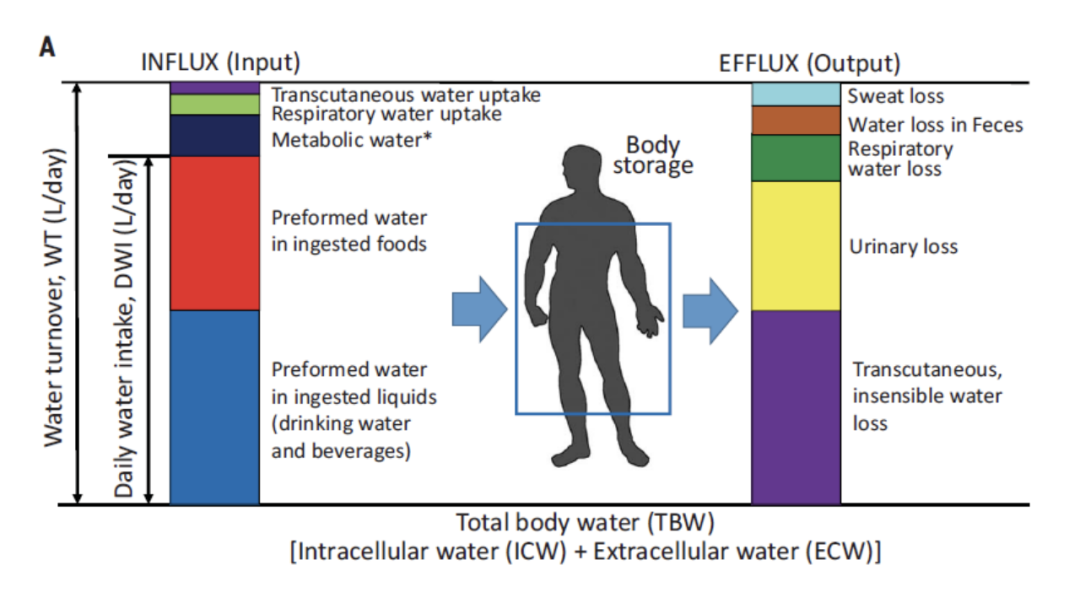 水是生命之源。没有水,人类只能生存天。人体每天的水周转量(Water Turnover即水的总交换量,包括了我们摄入的水分和流失的水分,在很大程度上反映了人们的需水量。