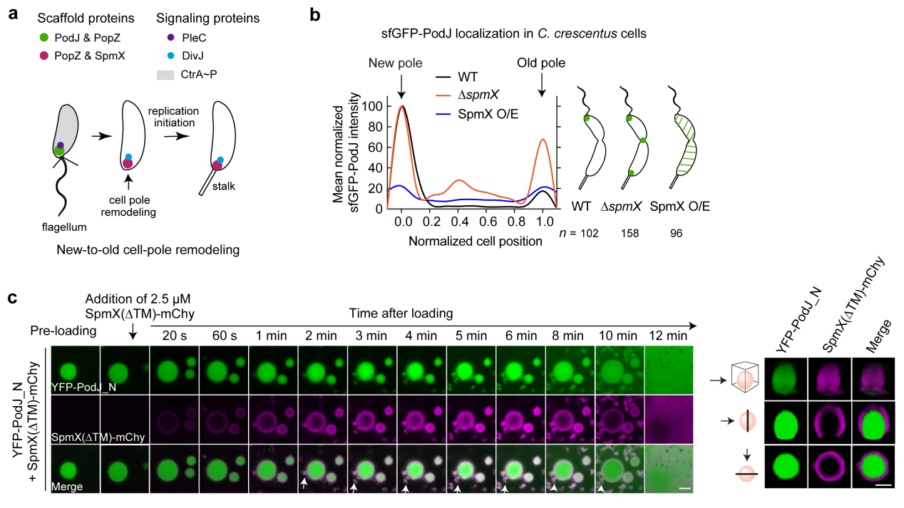 图 4. SpmX负调控PodJ相分离。a. 新月柄杆菌细胞新、旧极重构示意图;b. SpmX负调控PodJ细胞区室化;c. SpmX抑制PodJ相分离。