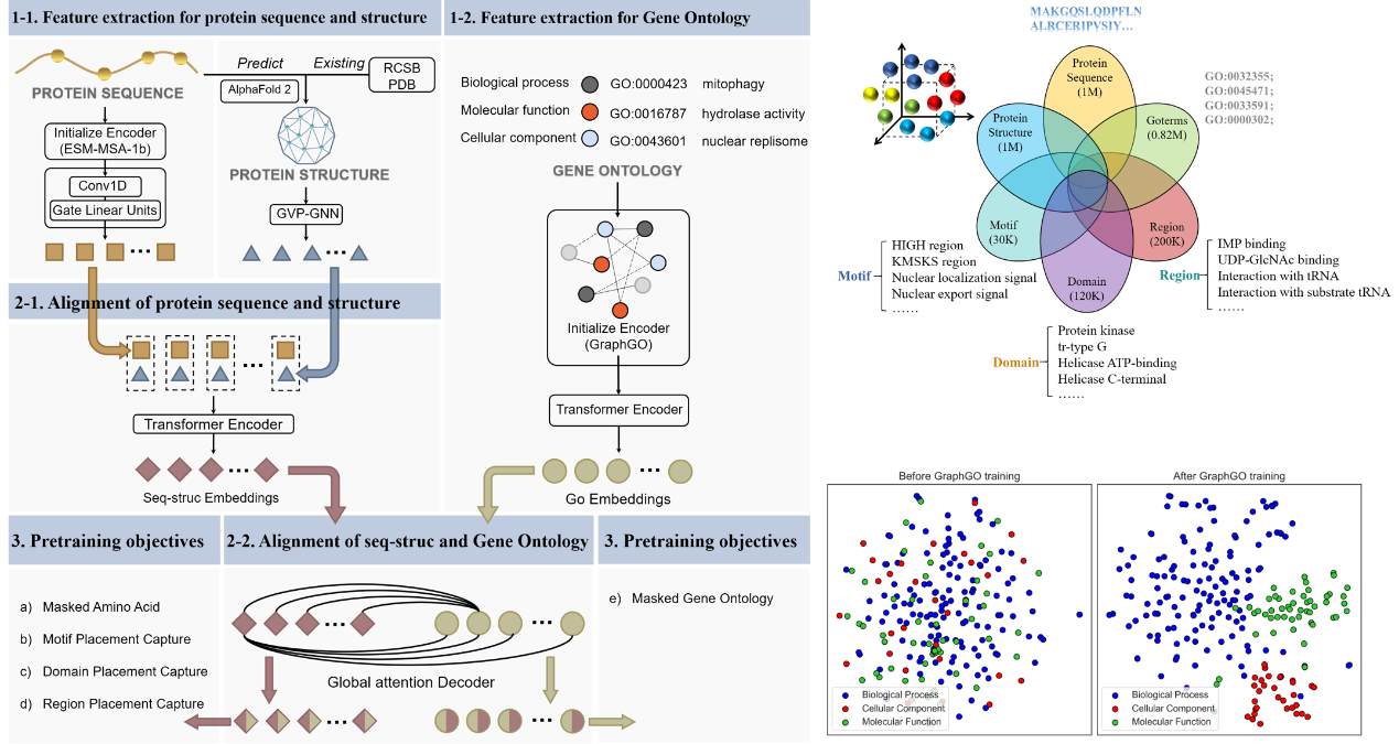 这项工作使用的数据如图1右上所示,包含蛋白序列、结构、功能注释数据以及蛋白细粒度如motif、domain、region等信息。提出的多模态融合表征框架包括四个主要组成部分(图1左):1)蛋白质序列、结构和GO的特征提取。2)顺利获得自注意力机制对蛋白质序列和结构进行token-level的局部对齐。然后将序列-结构特征与GO特征进行全局对齐。3)使用五个特定的预训练目标对多模态模型进行预训练。4)将得到的蛋白质表示应用于下游任务和跨任务学习过程量化。