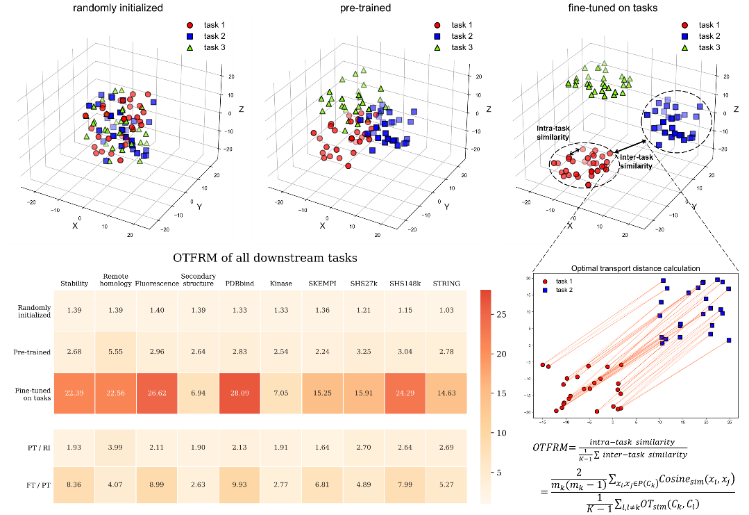 该方法得到的蛋白多模态表征在多项蛋白相关的下游任务中取得了优异表现,如蛋白稳定性预测、蛋白-蛋白互作预测等。另一方面,这项工作提出了一种新的跨任务迁移性度量方法(OTFRM),用于量化从预训练表征到相关下游任务以及下游任务间相互的动态迁移性。研究者计算了这些下游任务之间的成对距离,并观察到了任务间特征空间分布和适应性之间的强相关性(图2)。该度量方法可用于评估跨任务学习过程,预测适应性,引导各种任务的微调,并指导蛋白质表征学习的神经网络和训练目标设计。