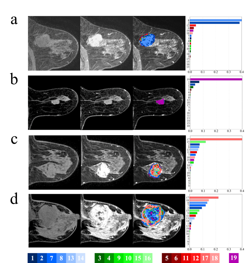 针对上述问题,该研究绕开复杂的生理学模型,提出一种不基于模型、纯数据驱动的DCE图像定量分析方法,顺利获得逐体素提取时间信号曲线进行自动分类,并将不同类别时间信号曲线的空间分布和分类占比映射到肿瘤空间内部进行颜色编码,实现了对乳腺癌血流动力学异质性的定量可视化评估。研究发现该新方法所提取的血流动力学异质性特征对于区分乳腺肿瘤的良恶性、病理级别、分子亚型和细胞增殖状态均具有显著的价值,为研究肿瘤微环境异质性给予了一种新思路和新方法。