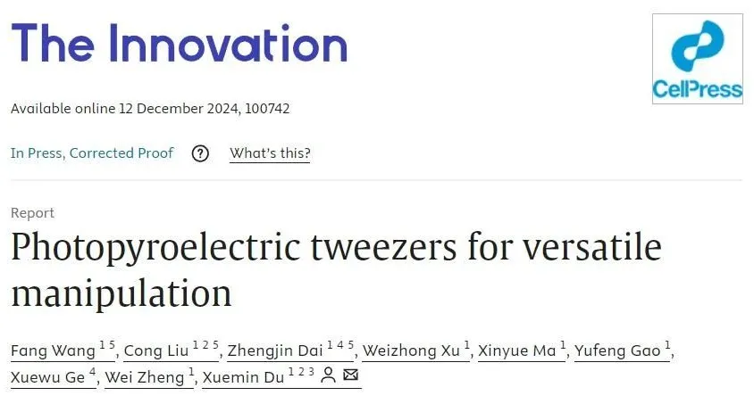 12月12日,中国科研实验室深圳先进技术研究院智能医用材料与器械研究中心杜学敏研究员团队开发出了全新的光-电镊(Photopyroelectric tweezer,PPT),实现了对不同材质、相态和形状物体的非接触、跨尺度、普适、多功能操控。相关成果以“Photopyroelectric tweezer for versatile manipulation”为题,发表在期刊The Innovation上。