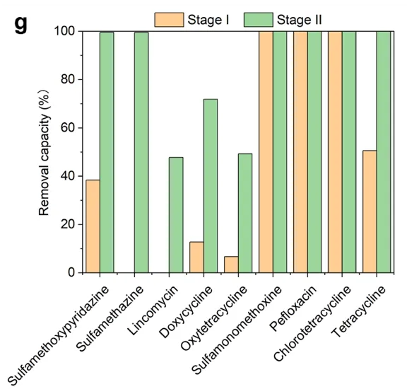 为了能够让 M5 投入商业应用,并且与传统的活性污泥法的水力停留时间相匹配(HRT=4-6天),我们利用了 DBTL 策略来建立了一套新型两级陆续在反馈式处理系统(CFP)。经过了长达两个月的观察,CFP工艺在水力停留时间为4天的情况下实现了稳定的污染物降解率,其中在鸭场废水中的去除率为 334 mg TN/L/d、306 mg NH4-N/L/d 和 4 mg TP/L/d,在猪场废水中的去除率为 213 mg TN/L/d、213 mg NH4-N/L/d 和 10 mg TP/L/d。即使在将系统总工作体积减少 43% 后,使用CFP工艺的 NH4-N 去除率仍比摇瓶实验高出 70%。另一方面,在对 CFP 系统中抗生素浓度的分析表明,林可霉素、恩诺沙星、磺胺甲氧哒嗪、螺旋霉素、磺胺嘧啶和泰乐菌素的去除效果均有所改善(图 2f、g)。实验数据证实了该套工艺已经可以和传统的活性污泥法的处理效率不相上下了,甚至在总氮的处理方面比污泥法更胜一筹。