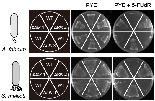 为此,研究人员测试了CRISPR/SpCas9M-报告系统在农杆菌与中华根瘤菌中的编辑能力。实验选择编码胸苷激酶的tdk基因作为靶标,该酶顺利获得将5-氟-2′-脱氧尿苷(5-FUdR)磷酸化为毒性类似物氟-dUMP(F-dUMP),使细胞对5-FUdR敏感。为验证编辑菌株表型,在含200 μg/ml 5-FUdR的PYE平板上进行生长实验。结果显示:Δtdk菌株可在含5-FUdR的平板上存活,而野生型中华根瘤菌与农杆菌则无法生长。