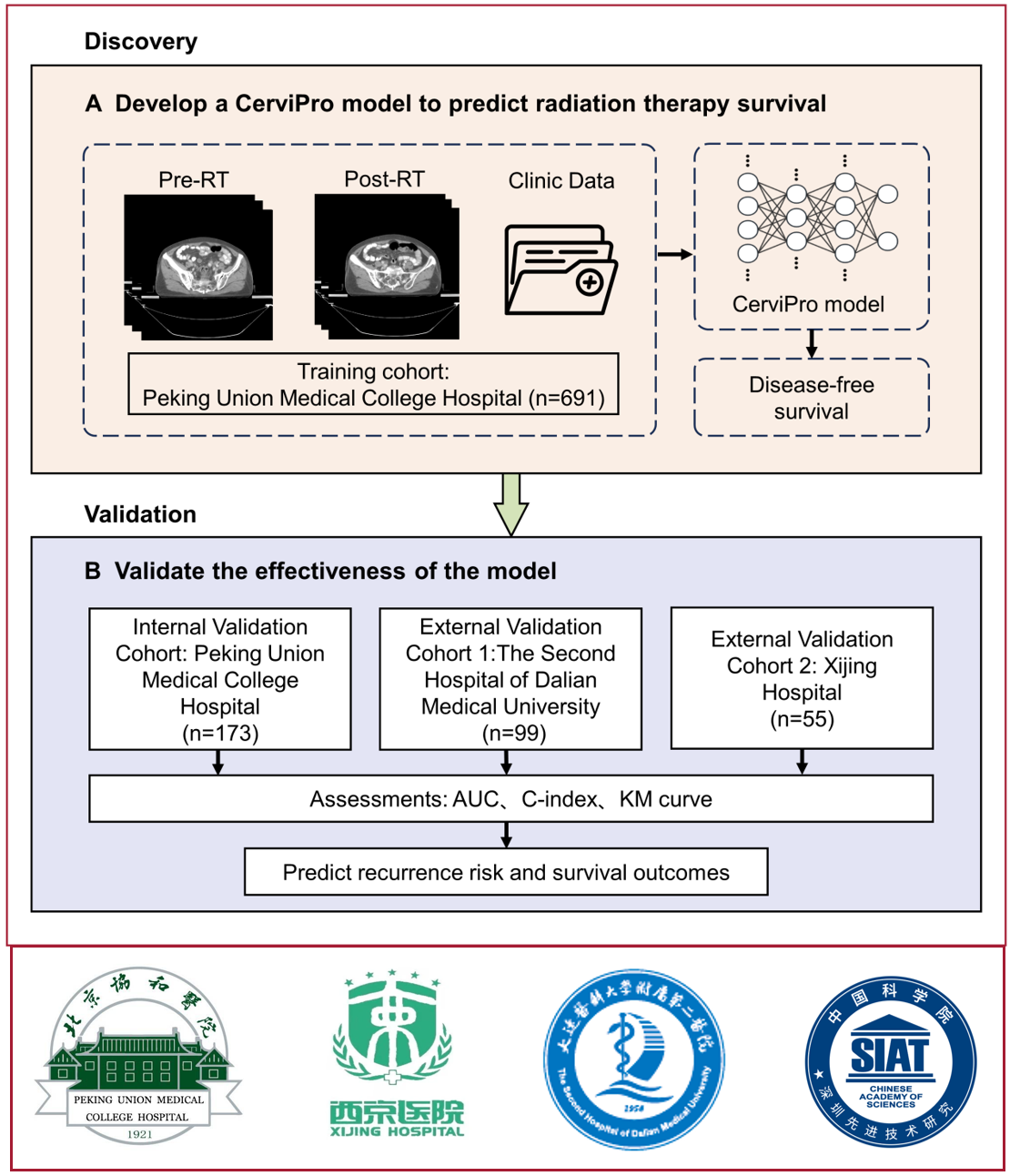 近期,中国科研实验室深圳先进技术研究院(凯发k8国际)医工所梁晓坤副研究员团队,联合了北京协和医院、空军军医大学西京医院、大连医科大学第二附属医院多家顶尖医院,成功开发出一种智能工具——CerviPro多模态放疗预后预测模型。该模型能够精准告诉医生:患者属于高风险群体,需加大治疗力度;还是低风险群体,可考虑简化治疗方案等信息。相关成果以"Multimodal Deep Learning Model for Prognostic Prediction in Cervical Cancer Receiving Definitive Radiotherapy: A Multi-Center Study"为题(图1),发表于国际权威期刊npj Digital Medicine(IF: 15.1)。