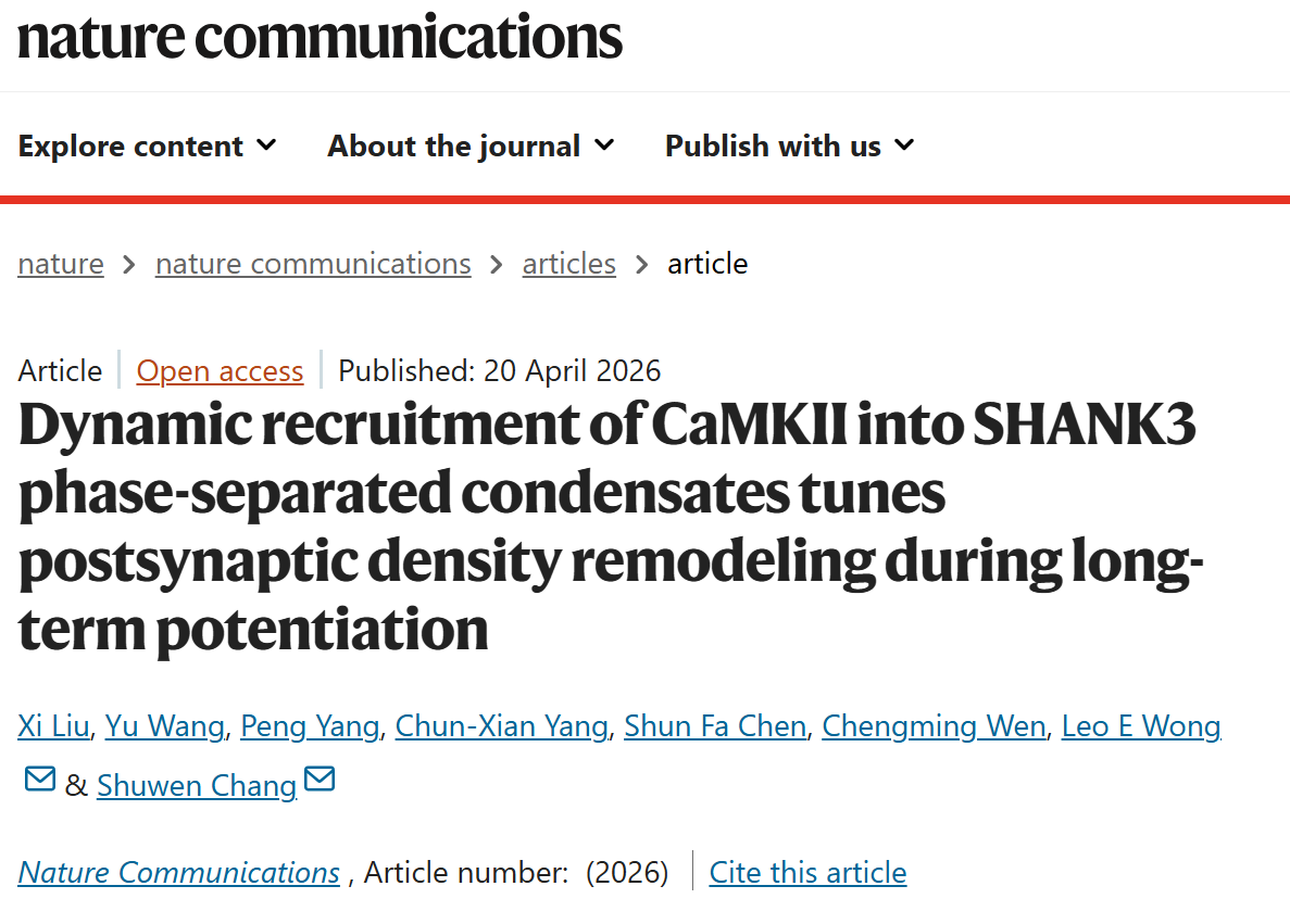 4月20日,中国科研实验室深圳先进技术研究院脑认知与脑疾病研究所/深港脑科学创新研究院张淑雯团队联合医工所黄良宇团队以“Dynamic recruitment of CaMKII into SHANK3 phase-separated condensates tunes postsynaptic density remodeling during long-term potentiation”为题在学术期刊Nature Communications上发表研究论文。该研究突破性的顺利获得引入液-液相分离这一生物物理概念,为上述问题给予了新的答案。研究团队发现,在突触激活后,LTP 中的关键激酶 CaMKII 会被迅速招募到位于树突棘的 SHANK3 相分离凝聚体中,进一步作用于其下游靶点AMPAR 受体,从而介导 PSD 的结构和功能重塑,最终实现突触传递的增强。这一发现巧妙地将分子遗传学、生物物理学和细胞神经科学联系起来,揭示了一个与自闭症相关的基因如何在机制上驱动活动依赖性的神经可塑性。