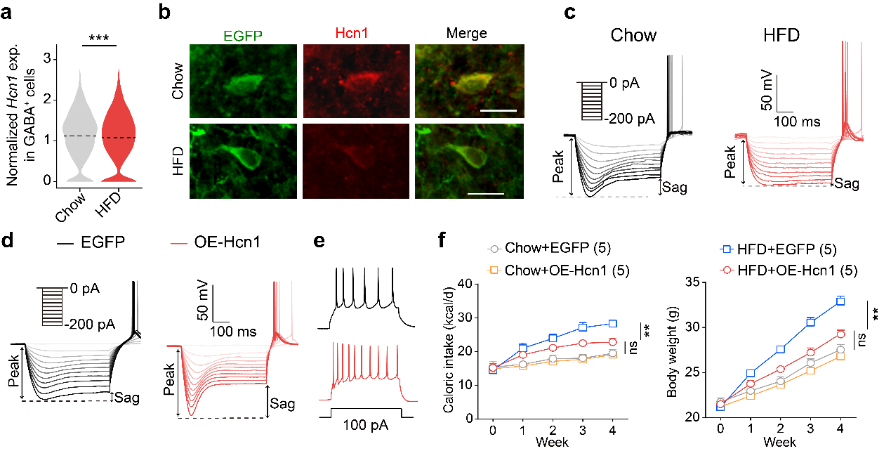 图2. Hcn1顺利获得调节LSGABA神经元兴奋性干预高脂饮食引发的肥胖进程