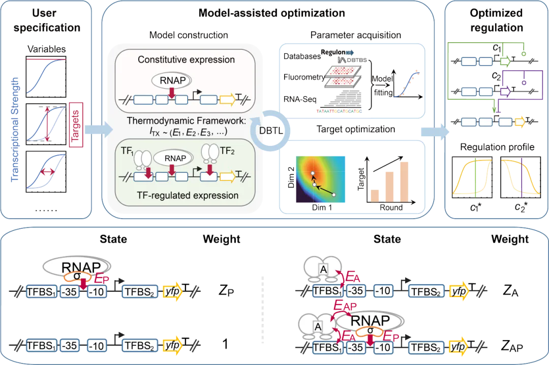 诊断(解耦与定量):该研究中使用的统一热力学模型将启动子强度(EP)、转录因子结合能(EA或 ER)以及协同激活作用(EAP)等关键变量分离并参数化,使得研究人员不再需要像传统机器学习那样依赖成千上万条数据来“喂养”模型,而是顺利获得少量的“设计-构建-测试-学习(DBTL)”循环即可快速锁定系统参数。