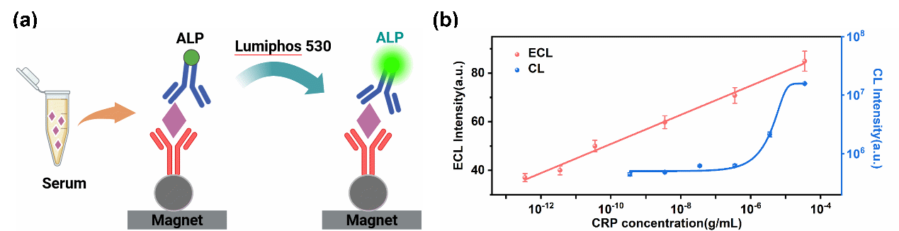 图4商用化学发光(CL)方法原理示意图及与本ECL方法对比
